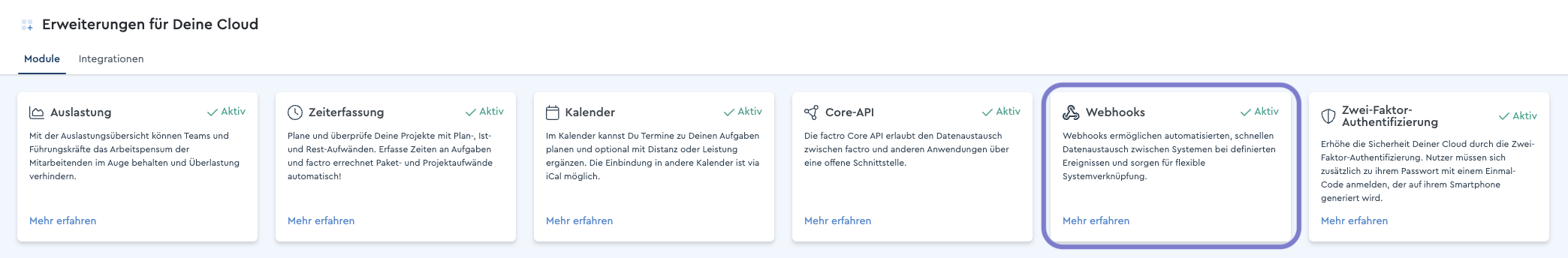 Nur der Cloud Owner kann die Webhooks aktivieren. Die Option findest Du unter "Erweiterungen"