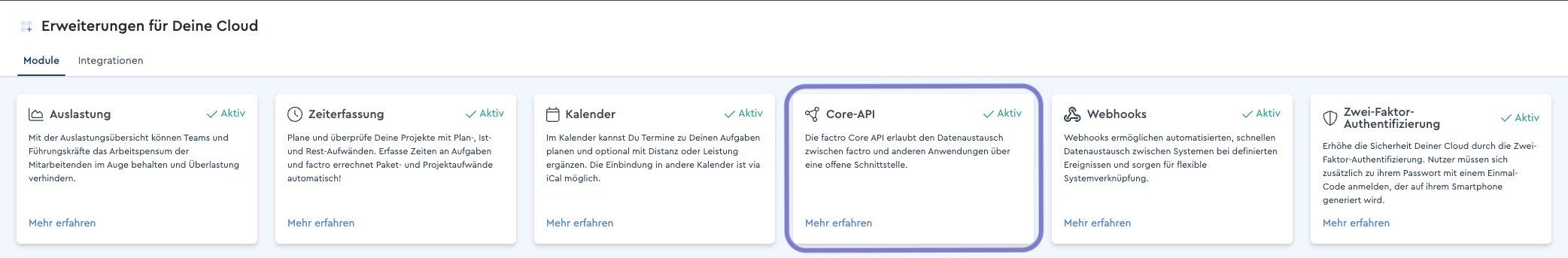 Wenn Du factro bereits nutzt, die API aber noch nicht aktiviert ist, kann der Cloud-Besitzer diese Aktivierung einmalig vornehmen. Eine erneute Deaktivierung ist danach nicht mehr möglich.