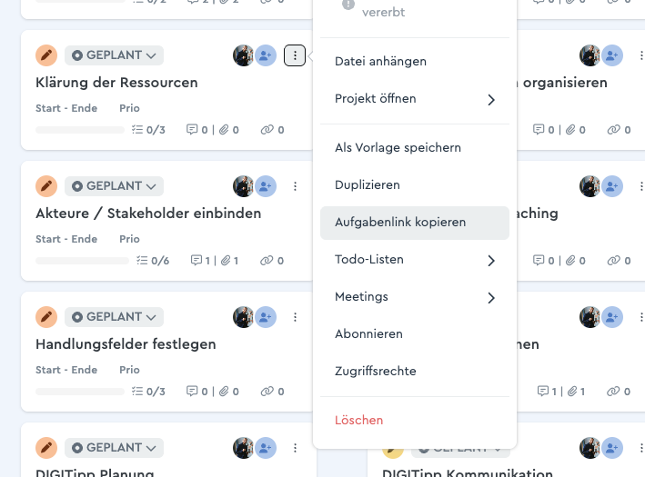 rufst über die drei vertikalen Punkte das Aufgabenmenü auf und klickst dort auf "Aufgabenlink kopieren". Die URL zur Aufgabe wird automatisch in die Zwischenablage kopiert und kann anschließend z.B. per Chat oder E-Mail geteilt werden. Damit der Empfänger die Aufgaben sehen kann, muss er Mitglied in Eurer Cloud sein und mindestens Leserechte für die Aufgabe besitzen.