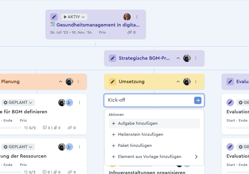Innerhalb eines Projekts kannst Du neue Aufgaben direkt unter einem Paket anlegen und per Drag & Drop an die gewünschte Stelle ziehen. Tippe dafür einfach den Aufgabentitel ein und bestätige ihn mit "Enter".