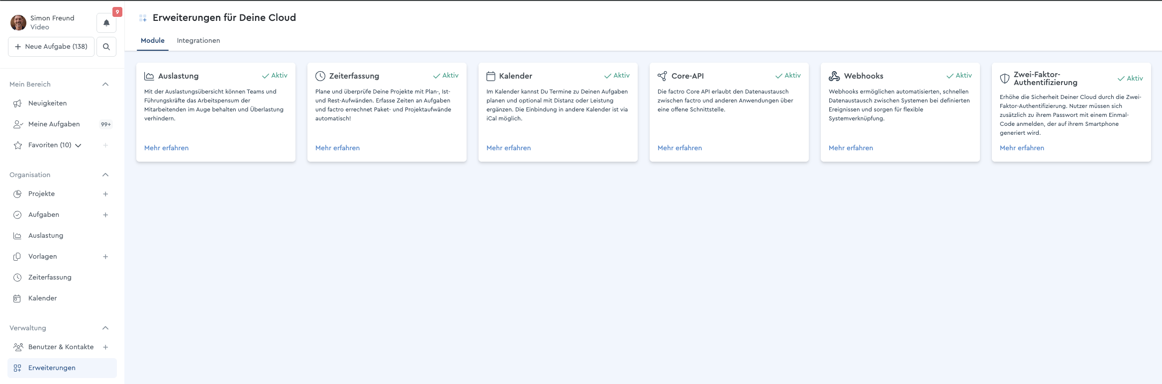 Als Cloud Owner hast Du die Möglichkeit, die Zeiterfassung sowie die Auslastung für die gesamte Cloud auszublenden. Dafür klickst Du im rechten Menüband auf "Erweiterungen" und blendest dort jede Funktion einzeln aus. Die jeweilige Ansicht verschwindet anschließend aus dem Menü. Eure bereits eingetragenen Daten gehen dabei nicht verloren.