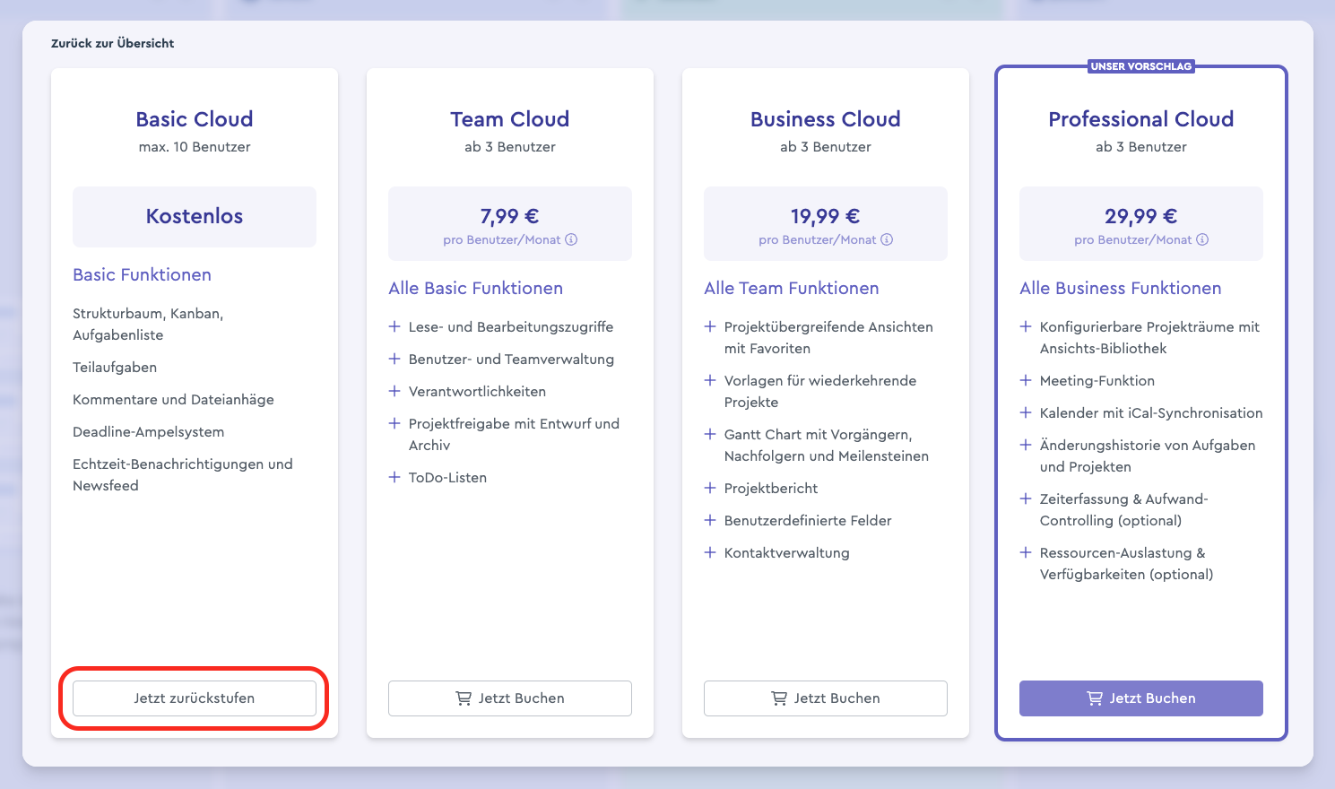 Dort hast Du die Möglichkeit, entweder die Professional Cloud verbindlich zu buchen oder Dich für anderen Tarif zu entscheiden. Um den Tarif zu wechseln, klickst Du zunächst auf "anderen Tarif wählen". Anschließend öffnet sich eine Ansicht, die Dir unsere verschiedenen Tarifoptionen zeigt. Wenn Du Dich für die kostenlose Basic Cloud entscheidest, gehst Du in der entsprechenden Kachel auf "Jetzt zurückstufen" und kannst anschließend wie gewohnt weiterarbeiten.
