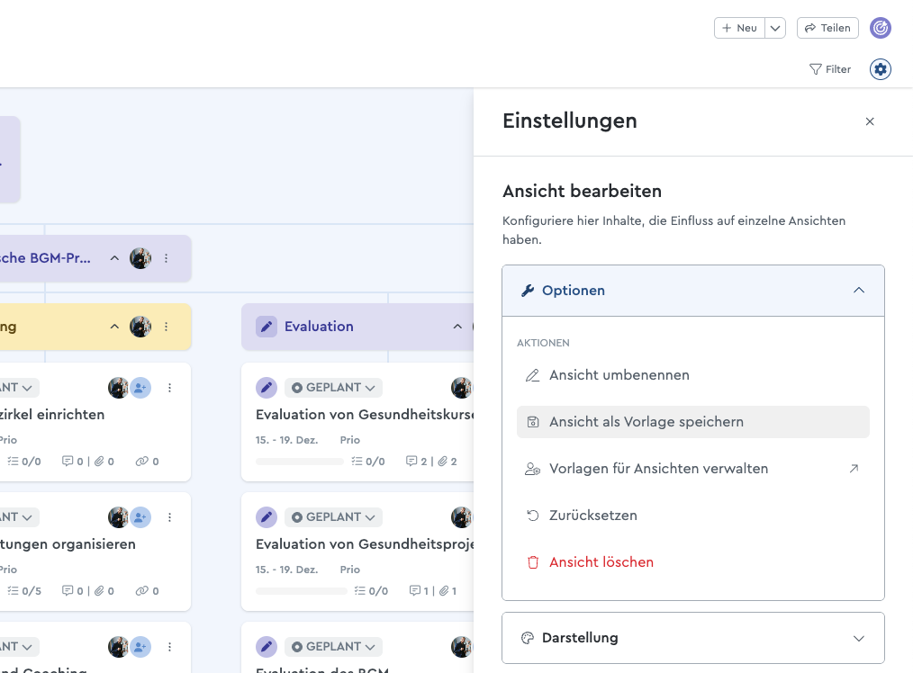 Eine Ansicht, die Du im Projektraum erstellt hast, kannst Du als Vorlage speichern. Beispielsweise dann, wenn Du die Ansicht auch in anderen Projekten benötigst oder sie – noch größer gedacht – als Standard in Deiner gesamten Organisation verfügbar sein soll. So könnt Ihr Euch gegenseitig mit Vorlagen inspirieren oder einfache Grundlagen für die Projektarbeit schaffen.